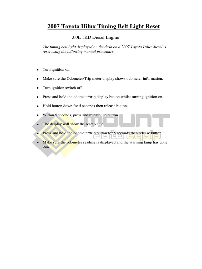 2007 Toyota Hilux Timing Belt Light Reset PDF PDF Hilux Timing Belt Reset Press selector and hold for 5 seconds, don't let go. Switch ignition on and select odo 2. to reset the timing belt warning light on a toyota hilux, you can follow these steps: we show you how to turn off your timing belt warning light in your toyota hilux. the timing belt light displayed on the dash. Hilux Timing Belt Reset.
